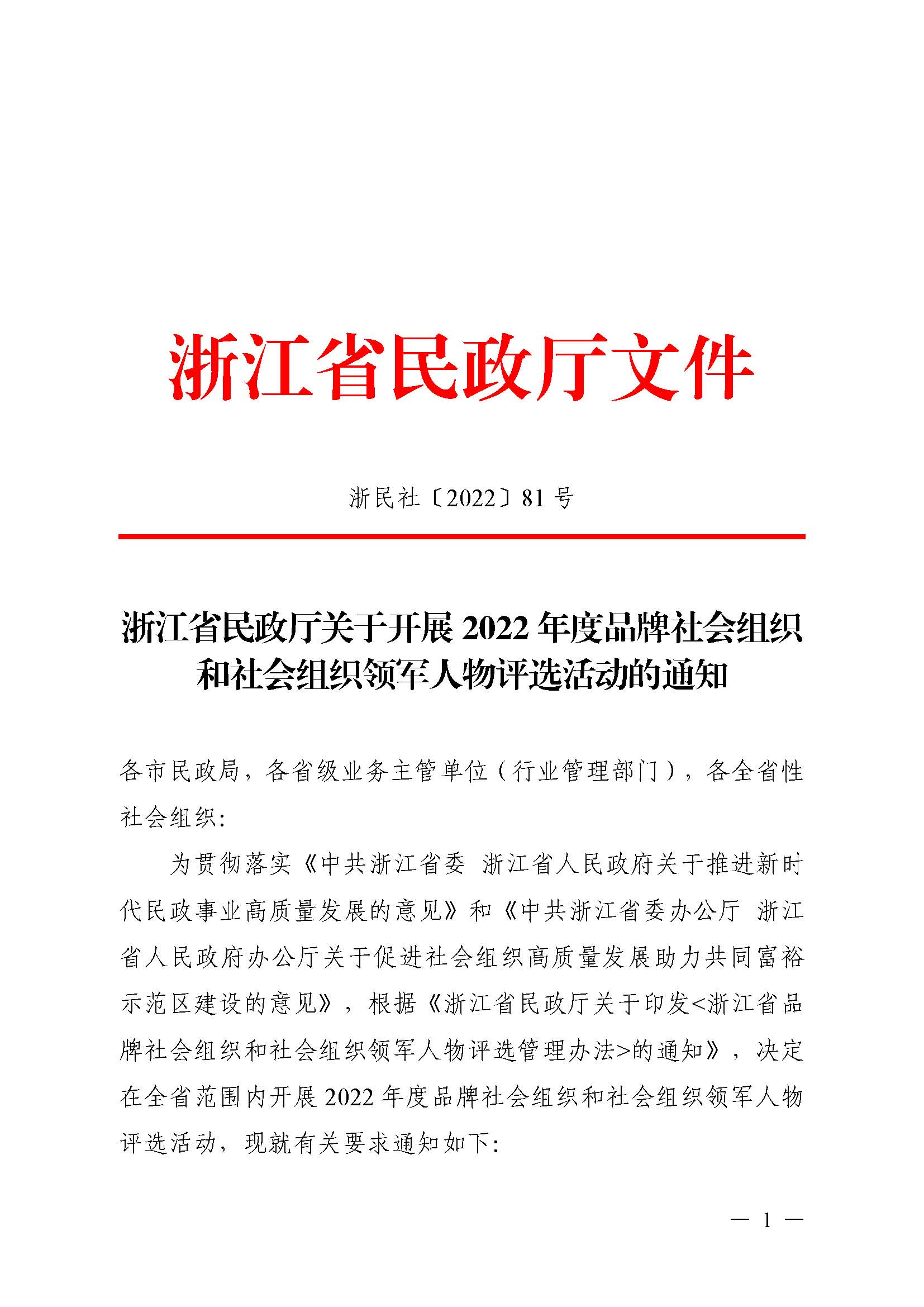 浙民社(2022)81号浙江省民政厅关于开展2022年度品牌社会组织和社会组织领军人物评选活动的通知.pdf